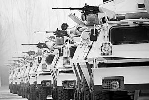 車隊(duì)啟動(dòng)了。一路上,沿途不斷傳來(lái)槍聲和爆炸聲,伊拉克警察和美軍車隊(duì)不時(shí)從身邊疾馳而過(guò)。席栓柱和戰(zhàn)友們?cè)谲噧?nèi)頭戴鋼盔、身穿防彈衣,手指頭一刻也不離開(kāi)扳機(jī),眼睛全神貫注地搜索著窗外每一個(gè)可疑情況。
