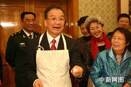 當?shù)貢r間二月一日中午,正在英國訪問的中國總理溫家寶來到中國駐英大使館看望外交人員和華僑華人。他和大家一起包餃子,還風趣地說自己包餃子的手藝很不錯。中新社記者 張朔攝