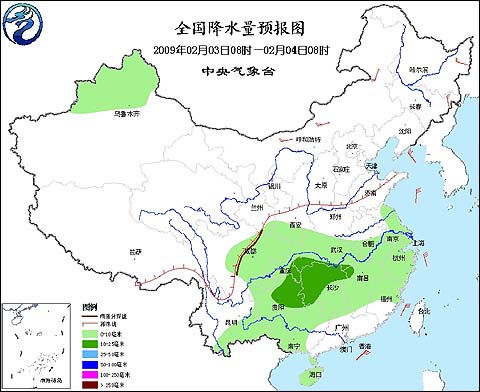 中央氣象臺(tái)2009年2月3日06時(shí)發(fā)布未來三天天氣預(yù)報(bào):