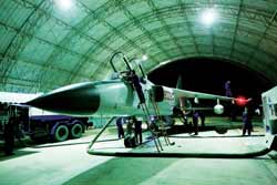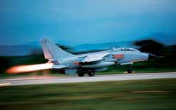 “1號(hào)請(qǐng)求起飛!薄鞍从(jì)劃執(zhí)行!币磺袦(zhǔn)備就緒后,塔臺(tái)指揮員干凈利索地下達(dá)了命令。18時(shí)25分,該團(tuán)團(tuán)長(zhǎng)李軍第一個(gè)駕駛“飛豹”戰(zhàn)機(jī)沖向跑道。頓時(shí),機(jī)場(chǎng)上響起巨大轟鳴聲,震得記者耳朵嗡嗡作響。滑行,加力,起飛,戰(zhàn)鷹閃著亮光騰空而起,噴著橘紅色的尾焰直沖蒼穹,最后消失在茫茫夜色之中。