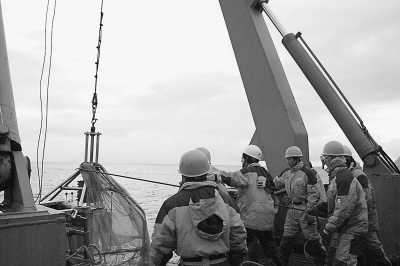圖為南極考察隊(duì)隊(duì)員和雪龍船船員合力將萬米絞車上的多管采集器收回。