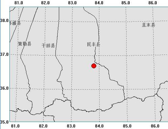 據(jù)測(cè)定,地震發(fā)生于當(dāng)天夜間21時(shí)52分(北京時(shí)間),震中位于北緯36.7°,東經(jīng) 83.8°。目前尚未接到有關(guān)人員及財(cái)產(chǎn)損失的報(bào)告。