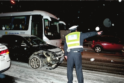 昨天,(北京)市交管局于清晨6點(diǎn)和晚高峰時(shí)分別啟動(dòng)三級(jí)雪天疏導(dǎo)方案,加派3000名警力上路維護(hù)疏導(dǎo)。由于路面濕滑車速變慢,事故有所增多,傍晚雪情使晚高峰時(shí)間有所延長。昨晚8點(diǎn)開始,京津塘、京津第二高速、京沈高速先后被封閉。