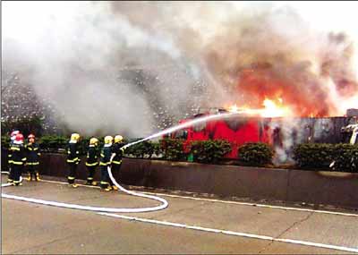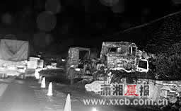 據(jù)交警介紹,車禍發(fā)生時,一輛貨車滿載打火機(jī)及洗發(fā)水等易燃易爆物品,因此火勢很猛,車上不時傳來打火機(jī)的爆炸聲,碎片不斷地從車廂內(nèi)飛出,貨車的油箱也處于被烘烤狀態(tài),隨時有爆炸的危險。