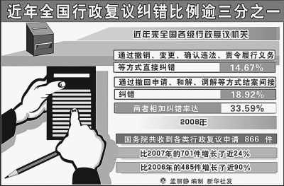 “行政復(fù)議化解行政爭議的作用日益明顯!2月19日,國務(wù)院法制辦主任曹康泰在全國行政復(fù)議工作經(jīng)驗交流暨“雙先”、“雙優(yōu)”表彰大會上介紹,2008年,國務(wù)院共收到行政復(fù)議申請866件,比2006年增長近90%,全國每年通過行政復(fù)議化解的行政爭議約8萬件左右。