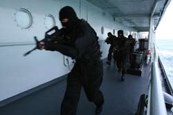 這時(shí),我利用甚高頻國際頻道和高音喇叭對恐怖分子進(jìn)行喊話,開展強(qiáng)大的心理攻勢和談判攻心。在談判未果的情況下,指揮員命令水面艦艇和空中火力支援的直升機(jī),同時(shí)對恐怖分子進(jìn)行火力壓制,掩護(hù)海上、空中突擊隊(duì)通過救生艇平面輸送和空中滑降的方式,快速、同時(shí)、多方位立體登臨被劫持貨輪。