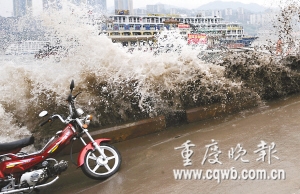 昨下午2時,朝天門六碼頭,岸邊玩耍的市民突然遭遇兩米多高的巨浪襲擊。因躲閃不及,好幾位市民濕身。正在浮船上作業(yè)的水手也隨浮船被巨浪抬起半米多高,浮船險些失控。