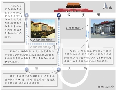 據(jù)介紹,在每次開會、散會前,天安門廣場西側(cè)路、人民大會堂南側(cè)路及人民大會堂西側(cè)路將分別采取交通管理措施,禁止各種車輛和行人通行。屆時,天安門廣場西側(cè)路北口、人民大會堂西側(cè)路北口、前門西站、供電局路口將設置電子顯示屏,誘導社會車輛繞行。