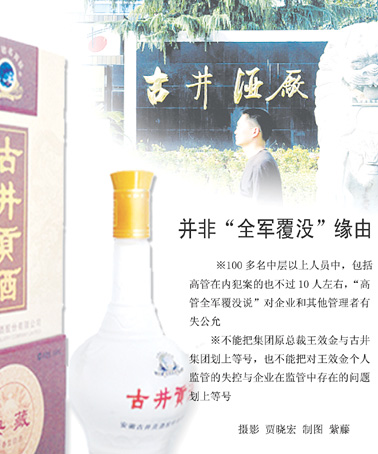 “不論在時(shí)空上還是判斷上,都不能這么隨意地將‘全軍覆沒(méi)’與古井集團(tuán)高管劃上等號(hào)!辈芙芨嬖V記者,在王效金(古井集團(tuán)原總裁)窩案中,古井集團(tuán)的7名高管只有3人涉案,100多名中層以上人員中,包括高管在內(nèi)犯案的也不過(guò)10人左右,“高管全軍覆沒(méi)說(shuō)”對(duì)企業(yè)和其他管理者有失公允。