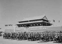 阿木古楞:受閱壓力很大,覺得在天安門接受毛主席檢閱,比打錦州沖鋒陷陣還緊張啊。記得閱兵總指揮楊成武在會(huì)上對(duì)各部隊(duì)指揮員說,誰的馬驚了,就撤團(tuán)長的職。我們真擔(dān)心出岔子啊。部隊(duì)訓(xùn)練很刻苦,士兵很下功夫。在北京駐訓(xùn)時(shí)正是炎夏,北京熱呀。我們騎兵常年駐在草原,涼快慣了,熱得人和馬都受不了。我們每天早上4時(shí)起床,5時(shí)就開始訓(xùn)練,練到10時(shí)才休息,下午接著練,一直練到黃昏。特別是馬不好練。我們的馬都是從戰(zhàn)場上下來的,打仗可以,騎手雙腿一夾,馬撒腿就往上沖,現(xiàn)在不行,必須步伐整齊。要踩著音樂,跟上拍子。