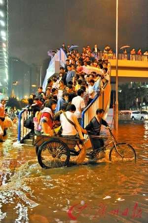 見聞:坐在車上,異味很重,幾個乘客把濕鞋脫下來晾。有人大聲講電話:“我已經(jīng)坐了兩個小時了,才到華景路口。要不明天再走?”司機不時地打開車門,讓熬不住的人下車。
