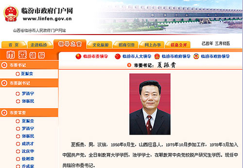 針對近日網(wǎng)上流傳的山西臨汾“自潰壩事故以來半年無人任市委書記”、“兩會”至今尚未召開”的信息,編輯上午瀏覽了“臨汾市政府門戶網(wǎng)”發(fā)現(xiàn):臨汾市政府網(wǎng)站仍顯示夏振貴現(xiàn)任臨汾市委書記,羅清宇則現(xiàn)任中共臨汾市委副書記、代市長。