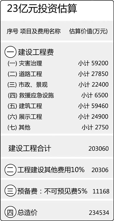 “主題為‘永恒北川’的北川國(guó)家地震遺址博物館整體設(shè)計(jì)方案已經(jīng)有關(guān)部門(mén)原則性通過(guò),初步預(yù)算總投資為23.45億元,資金一經(jīng)劃撥,將即時(shí)開(kāi)建。”