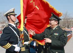 功夫不負(fù)有心人。負(fù)責(zé)閱兵訓(xùn)練的邱巍高將軍,放心不下?lián)?fù)軍旗手的我,有一次他單獨(dú)考核我。那天,我撐著4級風(fēng)刮得獵獵作響的軍旗,抬腿帶風(fēng),落地砸坑,身后跟隨將軍前來的參謀用鋼卷尺測量,每一步都是標(biāo)準(zhǔn)的75厘米,將軍滿意地笑了。