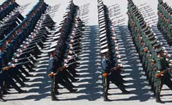時間定格在1984年10月1日,首都北京,天安門廣場。可容納50萬人的世界第一大廣場上,人山人海,紅旗招展。9點(diǎn)40分,黨和國家領(lǐng)導(dǎo)人登上天安門城樓。10點(diǎn)整,閱兵式開始。真正考驗我的時刻到了!鄧小平主席講話完畢,雄壯的《義勇軍進(jìn)行曲》響起,我將火紅的“八一”軍旗高擎在手中,正步走上天安門廣場,引導(dǎo)受閱大軍氣勢磅礴地通過天安門。天安門廣場由東到西743.25米,我踏著軍樂的節(jié)奏,按照每分鐘112步、每步75厘米的標(biāo)準(zhǔn)步幅,用時8分33秒、991步,分毫不差地落在了禮畢線上。方隊縱、橫、斜三線分明,踢腿帶風(fēng),足音如鼓,新聞媒體以“山的雄姿、海的壯闊”對儀仗方隊進(jìn)行了報道。