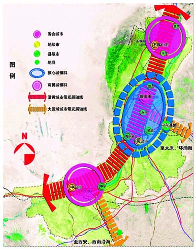 近年來(lái),寧夏回族自治區(qū)黨委、政府確定了向黃河靠攏的發(fā)展思路,大力實(shí)施中心城市帶動(dòng)戰(zhàn)略。2008年,寧夏進(jìn)入了城市化加速發(fā)展時(shí)期,全區(qū)城市化率達(dá)到45.5%,人均GDP超過(guò)2000美元,對(duì)經(jīng)濟(jì)社會(huì)發(fā)展的推動(dòng)作用日益凸顯。目前,寧夏沿黃河分布的銀川、石嘴山、吳忠、中衛(wèi)、平羅、青銅峽、靈武、賀蘭、永寧、中寧10個(gè)城市以43%的國(guó)土面積,集中了寧夏全區(qū)57%的人口、80%的城鎮(zhèn)、90%的城鎮(zhèn)人口,創(chuàng)造了寧夏90%以上的GDP和財(cái)政收入,已初具城市帶雛形。今后,寧夏將全面推進(jìn)這一地帶的城市化進(jìn)程,著力打造生命保障線、搶險(xiǎn)交通線、經(jīng)濟(jì)命脈線、特色城市線、生態(tài)景觀線和文化展示線。加快公交互通、金融同城、電訊同區(qū)、電力同網(wǎng)、信息共享步伐,形成以首府銀川市為中心的“一小時(shí)經(jīng)濟(jì)圈”,以石嘴山市、中衛(wèi)市、吳忠市三個(gè)沿黃地級(jí)市為次中心的“半小時(shí)通勤圈”,促進(jìn)中部干旱地區(qū)和南部山區(qū)10個(gè)縣(區(qū))的人口向沿黃地區(qū)聚攏。