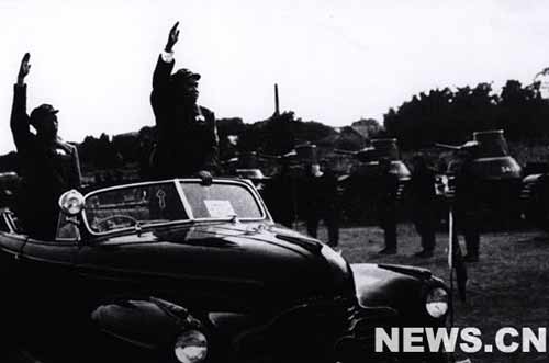 這次閱兵活動(dòng)是中國(guó)人民獲得解放后第一次軍事盛典。1949年10月1日,毛澤東主席在天安門(mén)城樓上莊嚴(yán)宣布:“中華人民共和國(guó)中央人民政府已于本日成立了!辈⒂H自升起第一面五星紅旗。閱兵司令員朱德總司令在閱兵總指揮聶榮臻陪同下,檢閱了受閱部隊(duì),并發(fā)布了《中國(guó)人民解放軍總部命令》。隨后,聶榮臻率領(lǐng)陸、海、空三軍受閱部隊(duì)的分列式由東至西從天安門(mén)城樓前通過(guò)。首先通過(guò)天安門(mén)廣場(chǎng)的是年輕的人民海軍,隨后跟進(jìn)的是步兵、炮兵、摩托化步兵、裝甲步兵、坦克兵和騎兵師。在步兵行進(jìn)的同時(shí),年輕的人民空軍各型戰(zhàn)機(jī)飛臨天安門(mén)上空接受黨和國(guó)家領(lǐng)導(dǎo)人及各界人民代表的檢閱。
