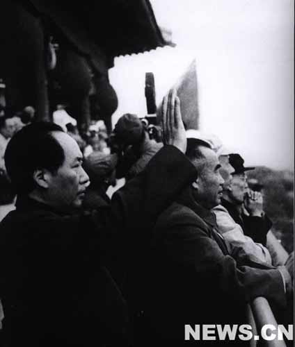 閱兵式接近結(jié)束時(shí),天色已晚,天安門廣場(chǎng)這時(shí)變成了紅燈的海洋。無(wú)數(shù)的彩色火炮從會(huì)場(chǎng)四周發(fā)射。歡呼著的群眾在閱兵式完畢后開始游行。當(dāng)群眾隊(duì)伍經(jīng)主席臺(tái)附近走出會(huì)場(chǎng)時(shí),"人民共和國(guó)萬(wàn)歲!""毛主席萬(wàn)歲!"的口號(hào)聲響入云霄。毛主席在擴(kuò)音機(jī)前大聲地回答著:"同志們?nèi)f歲!"毛主席伸出身子一再地向群眾招手,群眾則歡呼鼓掌,手舞足蹈,熱情洋溢,不能自己。當(dāng)游行的隊(duì)伍都已有秩序地一一走出會(huì)場(chǎng)時(shí),已是晚間九點(diǎn)二十五分。舉著紅燈游行的群眾象火龍似地穿過(guò)全城,使新的首都浸在狂歡里直到深夜。(新華社北京1949年10月1日電)
