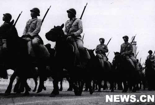 毛主席宣讀公告完畢,閱兵式開始。閱兵式由人民解放軍朱德總司令任檢閱司令員,華北軍區(qū)司令員兼京津衛(wèi)戍區(qū)司令員聶榮臻將軍任閱兵總指揮。朱總司令驅(qū)車檢閱各兵種部隊(duì),回到主席臺(tái)上宣讀人民解放軍總部命令。受閱部隊(duì)隨即分列經(jīng)主席臺(tái)前由東向西行進(jìn),前后歷時(shí)三小時(shí)。受閱部隊(duì)以海軍兩個(gè)排為前導(dǎo),接著是一個(gè)步兵師、一個(gè)炮兵師、一個(gè)戰(zhàn)車師、一個(gè)騎兵師,相繼跟進(jìn)?哲姲☉(zhàn)斗機(jī)、運(yùn)輸機(jī)、教練機(jī)共十四架在全場(chǎng)上空自東向西飛行受閱。在閱兵式中,全場(chǎng)掌聲象波浪一樣,一個(gè)高潮接著一個(gè)高潮。