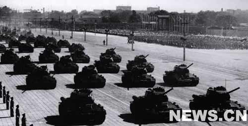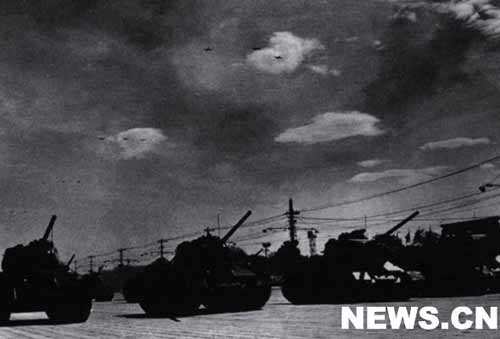 接著,受閱部隊(duì)開始分列式。軍事學(xué)院的隊(duì)伍邁開整齊的步伐首先走進(jìn)天安門廣場(chǎng)。緊跟在他們后面的是步兵學(xué)校、炮兵學(xué)校、工程兵學(xué)校、坦克學(xué)校、航空學(xué)校、海軍學(xué)校和水兵、公安軍、步兵、摩托化步兵、傘兵的隊(duì)伍。隨后,裝備著各種大口徑遠(yuǎn)射程大炮的炮兵部隊(duì)和威力強(qiáng)大的坦克部隊(duì)相繼通過了廣場(chǎng)。當(dāng)坦克部隊(duì)在天安門廣場(chǎng)出現(xiàn)時(shí),一隊(duì)隊(duì)噴氣式轟炸機(jī)和殲擊機(jī)風(fēng)馳電掣地飛過天安門上空。