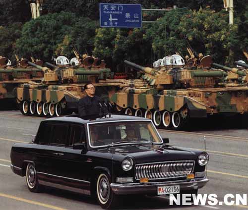 五十響禮炮的回聲還在廣場(chǎng)上空激蕩,紅旗牌檢閱車駛出天安門。中共中央總書記、中華人民共和國(guó)主席、中央軍委主席江澤民,身著中山裝,神采奕奕地站立在檢閱車的中央。