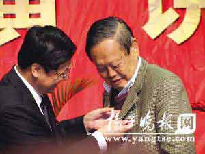 19日,應(yīng)邀參加揚(yáng)州煙花三月經(jīng)貿(mào)旅游節(jié)的世界杰出物理學(xué)家、諾貝爾獎(jiǎng)獲得者楊振寧博士做客揚(yáng)州大學(xué),欣然擔(dān)任該校榮譽(yù)教授,并為師生上了一堂精彩紛呈的“創(chuàng)新課”。臺(tái)上87歲的楊振寧聲音洪亮,妙語連珠;臺(tái)下33歲的楊夫人翁帆和人頭攢動(dòng)的師生一起,自始至終安安靜靜地當(dāng)“聽眾”。