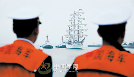 彩旗在風(fēng)中飄揚,禮炮在空中響起。4月18日晚7時許,美麗的青島港迎來了參加中國海軍60周年慶典的第一位“客人”——墨西哥的“夸烏特莫克”號風(fēng)帆訓(xùn)練艦。慶祝中國海軍成立60周年多國海軍活動,由此拉開了帷幕。
