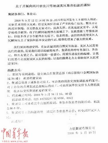中國青年報記者多次采訪了其中的一名員工劉燕寧。劉燕寧告訴記者她就是捐款的經(jīng)辦人。2008年5月15日,汶川特大地震發(fā)生后,經(jīng)請示力聯(lián)集團負責人翟韶均,力聯(lián)集團發(fā)出了《關于開展向四川省汶川等地震災區(qū)慈善捐款的通知》,號召廣大員工向災區(qū)捐款。這一倡議得到了廣大員工的響應和支持,很快,捐款源源而來。在指定的捐款截止日期——5月16日16:00前,公司募集到了地震捐款41423.1元。