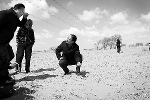 郭虎帶著氣象臺(tái)的年輕預(yù)報(bào)員,進(jìn)入一處沙地。當(dāng)時(shí)風(fēng)很大,吹得大家睜不開眼睛,“瞬間風(fēng)力能達(dá)到五六級(jí)!辈贿^,沒有沙塵。郭虎蹲下去,用手抓起一把沙子,一松手,沙子被吹出不遠(yuǎn)就飄落了。“這說明沙子里的水分很多!惫⒂檬峙倨鹕匙觼恚畈坏1厘米的表層下,沙子都是濕的。