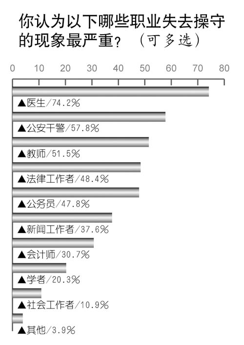 哪些職業(yè)失去操守的現象最嚴重?調查中公眾給出的排序依次為:醫(yī)生(74.2%)、公安干警(57.8%)、教師(51.5%)、法律工作者(48.4%)、公務員(47.8%)、新聞工作者(37.6%)、會計師(30.7%)、學者(20.3%)、社會工作者(10.9%)。