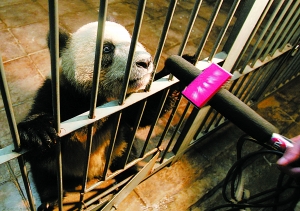 在曾有林驗貨時,飼養(yǎng)員楊海迪不失時機地給大熊貓們喂食礦泉水及蘋果、胡蘿卜等物。