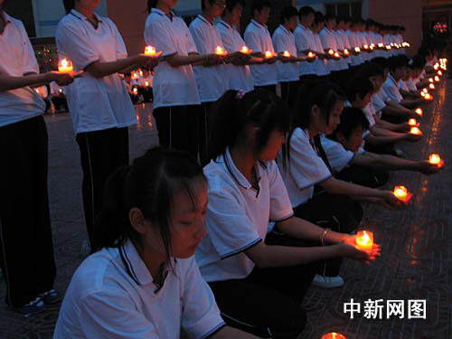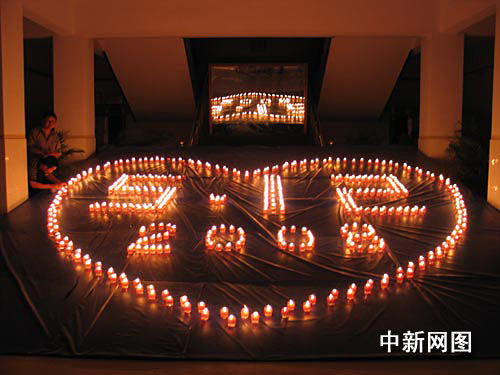 中新網(wǎng)隴南5月12日電 (記者 劉薛梅 張通飛) 11日晚上8點(diǎn),隴南市第二中學(xué)校園內(nèi),660名學(xué)生點(diǎn)燃蠟燭組成了一個(gè)“燭光大道”,校門正前方的多媒體教室內(nèi),300支蠟燭構(gòu)成了一個(gè)巨大的心形圖案,里面用蠟燭寫著“512”、“2008”。這里正在舉行一場(chǎng)詩(shī)歌朗誦會(huì),紀(jì)念地震一周年。