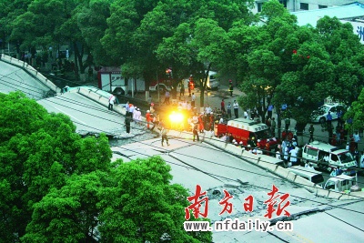 當(dāng)時(shí),數(shù)聲巨響鉆進(jìn)株洲市民李先生的耳朵。辦公室的同事隨即放下手中的工作,擠在窗口急切地想看下面發(fā)生了什么。一位女同事指向紅旗廣場(chǎng)的方向,用驚恐的聲音告訴他們“垮橋了”。李先生放眼望去,垮橋的地點(diǎn),距離他辦公室不過數(shù)百米的紅旗廣場(chǎng)附近。