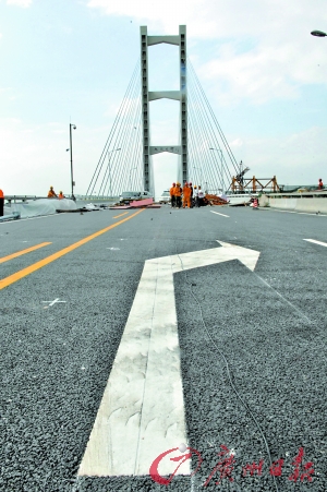 記者看到,除了為大橋兩段的防護(hù)欄涂水泥外,部分工人正忙著安裝新路燈,現(xiàn)場還有幾名工程師用電腦設(shè)備測試大橋通車時(shí)的共振頻率,確保通車后各方面的安全性能。
