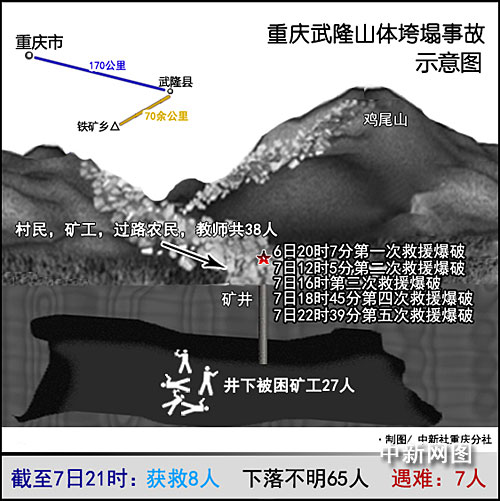 5日下午3時(shí)發(fā)生的重慶市武隆縣鐵礦鄉(xiāng)雞尾山山體垮塌災(zāi)害,直接導(dǎo)致山對(duì)面的三聯(lián)采礦場(chǎng)和幾所民居及一些路人被埋。經(jīng)過(guò)兩天兩夜的搜救工作,截至7日23時(shí),救援人員已發(fā)現(xiàn)7位遇難者遺體。包括此前救出的8名傷者和證實(shí)2名失蹤者當(dāng)時(shí)不在事故現(xiàn)場(chǎng)外,尚有65人下落不明,其中,被埋井下有礦工27人。