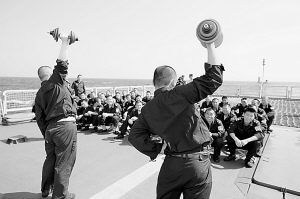 護(hù)航編隊(duì)艦艇的擴(kuò)音器、對(duì)講機(jī)里,幾乎每天都能傳出戰(zhàn)斗號(hào)角般的聲音。我們的官兵,就是在如此高度緊張的戒備氛圍中度過一百多天護(hù)航生活的。