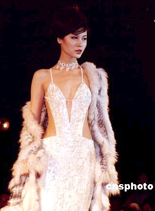 裘皮革皮制品交易會(huì)上模特展示裘皮晚裝