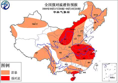 中新網(wǎng)6月17日電 中央氣象臺18時發(fā)布強對流天氣預(yù)報,預(yù)計今天夜間到明天白天,新疆北部和西南部、西北地區(qū)東部、內(nèi)蒙古大部、華北大部、東北大部、青藏高原東部、西南地區(qū)西南部和東北部、黃淮大部、湖北、江淮、江南大部、華南中南部等地將有雷暴天氣,其中,甘肅東部、寧夏、陜西北部、內(nèi)蒙古中東部地區(qū)局地有冰雹、短時強降水、雷雨大風(fēng)等強對流天氣,河南南部、安徽、江蘇大部、湖北大部、湖南東北部、江西北部、浙江、上海、福建北部、廣西東南部、廣東西南部、海南局部有短時強降水、雷雨大風(fēng)等強對流天氣。