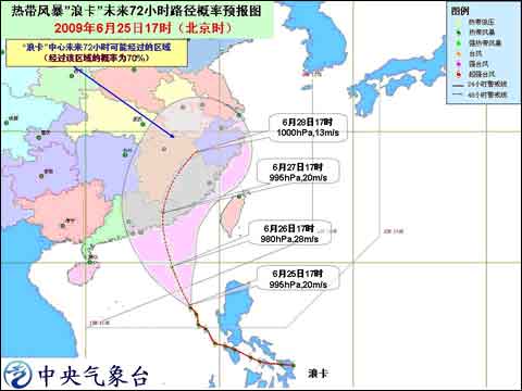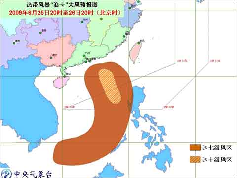 預(yù)計,風暴中心將以每小時15-20公里的速度向西北方向移動,以后將轉(zhuǎn)向偏北方向移動,逐漸向廣東中部到福建南部一帶沿?拷,強度有所加強,并有可能于明天夜間到后天白天在這一帶沿海登陸。受“浪卡”和西南季風的共同影響,今天晚上到明天白天,南海東部和南部海面將有6-8級大風,“浪卡”中心經(jīng)過的附近海面的風力可達9-10級。