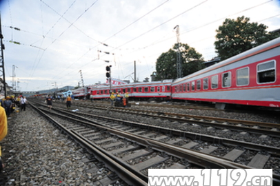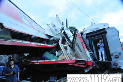 6月29日2時(shí)33分許,湖南公安消防總隊(duì)郴州市消防支隊(duì)指揮中心接到報(bào)警:飛虹橋道口兩列客運(yùn)火車相撞(K9017次列車撞上了稍前脫軌的K9063次列車),其中一列撞上附近一民房,請求救援。