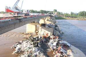 14時,鐵力市政府緊急召開了關于哈伊公路鐵力市呼蘭河大橋橋體壓塌事件的第一次新聞發(fā)布會。據(jù)鐵力市委常委、副市長李慶生介紹,29日2時34分,鐵力市公安局110指揮中心接到群眾報警,位于伊哈公路123公里處的鐵力市呼蘭河大橋,被由哈市方向開來的一輛車號為黑F51650的拉鋼的材超重掛車壓塌橋體,該車和隨后趕來的車輛掉入橋下2米深的水中。