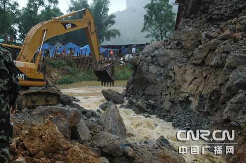 廣西羅城卡馬水庫右壩首泄洪槽在今天7時和中午12時15分兩次爆破之后,泄洪底口堅硬的混凝土護(hù)墻已被分解,但要過水還需加大開挖深度。13時,武警水電一總隊開挖突擊隊在三支隊支隊長朱國良的帶領(lǐng)下,冒雨展開反鏟清碴突擊戰(zhàn)。經(jīng)過5個小時的突擊行動,水電官兵成功開挖出泄洪槽。