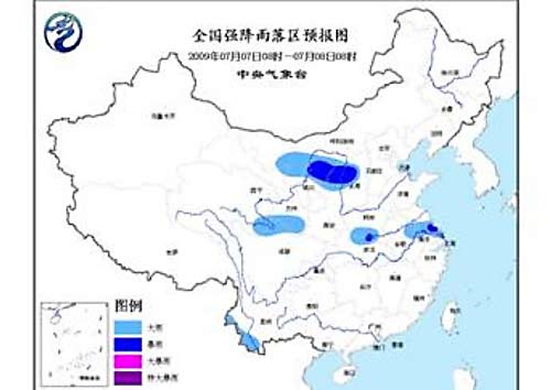 中新網(wǎng)7月7日電 中央氣象臺今日06時繼續(xù)發(fā)布暴雨預報:預計,今天白天到夜間, 內(nèi)蒙古西部、寧夏北部、陜西北部、山西北部、青海東南部、甘肅南部、四川北部、河南南部、湖北北部、蘇皖中南部、云南西南部等地的部分地區(qū)有大雨,其中內(nèi)蒙古河套地區(qū)、陜西北部、山西北部、湖北東北部、江蘇中部等地的部分地區(qū)有暴雨。