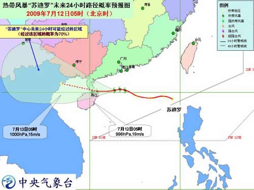 中新網(wǎng)7月12日電 中央氣象臺(tái)今日早晨6時(shí)發(fā)布臺(tái)風(fēng)橙色警報(bào):今年第5號(hào)熱帶風(fēng)暴“蘇迪羅”( SOUDELOR )的 中心已于12日早晨5時(shí)30分在海南文昌北部沿海登陸,登陸時(shí)中心附近最大風(fēng)速為18米/秒,中心最低氣壓994百帕。
