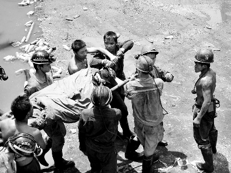 11時35分,施救人員把堵塞該巷道的淤泥和煤塊清開,發(fā)現(xiàn)里面有3名被困的工人,而且這3名工人還能說話,意識也是清醒的。施救人員立即用黑布將3人的眼睛包裹住,然后每8名救援人員用擔架抬起一名被困者,慢慢將他們送至井口。此時,早已聞訊的醫(yī)務人員來到井口,分別為3名礦工輸液,以保持生命體能。