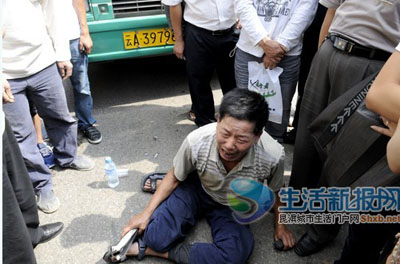 一名50多歲的男子擋在一輛77路公交車前,坐在地上痛哭,民警怎么勸說他也不愿意離開。男子稱:“這些城管太不講道理了,他們快把我的兒子打死了。”據(jù)該男子介紹,20多名城管人員昨日早上將其兒子打傷,兒子被送進醫(yī)院搶救,而打人的城管全部跑了,“實在是沒有辦法,我兒子不能白白受罪,無奈之下,我只能通過這種方法引起相關(guān)部門的重視!