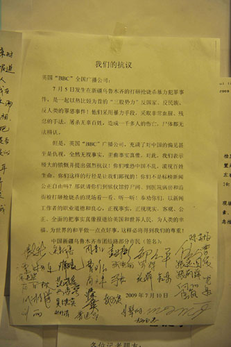 7月13日上午,當(dāng)記者來到設(shè)在烏魯木齊海德飯店的新聞中心時,這里的工作人員反映說,連日來他們不斷接到當(dāng)?shù)厥忻翊騺淼碾娫,反映西方媒體關(guān)于“7·5”事件的報道不但有失公充,而且無視基本事實,他們要求工作人員將他們的不滿和抗議轉(zhuǎn)告給相關(guān)的西方媒體記者。有些市民是直接將他們抗議信送到新聞中心,將其貼在那里。