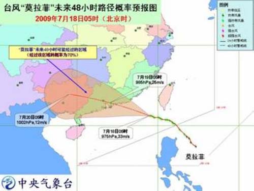 該警報顯示,今年第6號強熱帶風(fēng)暴“莫拉菲”(MOLAVE)已于18日凌晨進入南海東北部海面,隨后于早晨5時加強為臺風(fēng)。18日早晨5時其中心位于廣東省惠東縣東偏南方大約450公里的海面上,就是北緯21.2度、東經(jīng)119.0度,中心附近最大風(fēng)力有12級(33米/秒)。