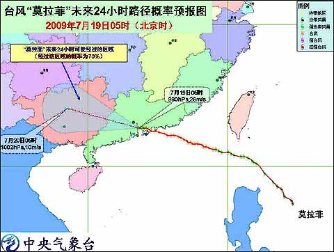 今年第6號臺風(fēng)“莫拉菲”(MOLAVE)的中心已于19日凌晨0時50分在廣東省深圳市大鵬半島沿海登陸,登陸時中心附近最大風(fēng)力有13級(38米/秒),中心最低氣壓965百帕。登陸后,“莫拉菲”強(qiáng)度逐漸減弱,19日凌晨4時在深圳市境內(nèi)減弱為強(qiáng)熱帶風(fēng)暴,19日早晨5時,強(qiáng)風(fēng)暴中心位于珠江口北部,就是北緯22.7度、東經(jīng)113.7度,中心附近最大風(fēng)力有10級(28米/秒)。