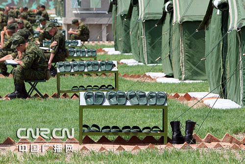 鳳凰衛(wèi)視記者:打靶歸來,第一件事情當(dāng)然是洗澡,不過這樣赤條條穿過軍營,在中國記者眼中實在是過于自由散漫,看來紀(jì)律嚴(yán)明的俄羅斯大兵,訓(xùn)練歸訓(xùn)練,生活還是生活,由中方承建的俄軍野營村,規(guī)模不大,但功能齊全,熨斗、網(wǎng)吧、電話亭,各種生活設(shè)施一應(yīng)俱全,面積達2750平方米的大食堂,每天都為1300名俄羅斯官兵,提供最地道俄式餐飲,雖然食物原料由中國制造,但17位廚娘清一色都來自俄羅斯,超市內(nèi)琳瑯滿目,應(yīng)有盡有,每一份商品都用中文和俄文注明詳細(xì)的價格,超市東西雖然便宜,還是要用人民幣來購買,所以俄羅斯士兵大都要到這里的貨幣兌換處來把手中的盧布換成人民幣,每100盧布,可以換19元人民幣。兌換處經(jīng)常大排長龍,但精通俄語的中方工作人員就說,開業(yè)一周以來,這里每天的交易額只是3萬盧布,折合人民幣6300元平均每人每天才兌換5塊錢,不知道是俄軍待遇差,還是俄羅斯經(jīng)濟衰退的緣故呢?